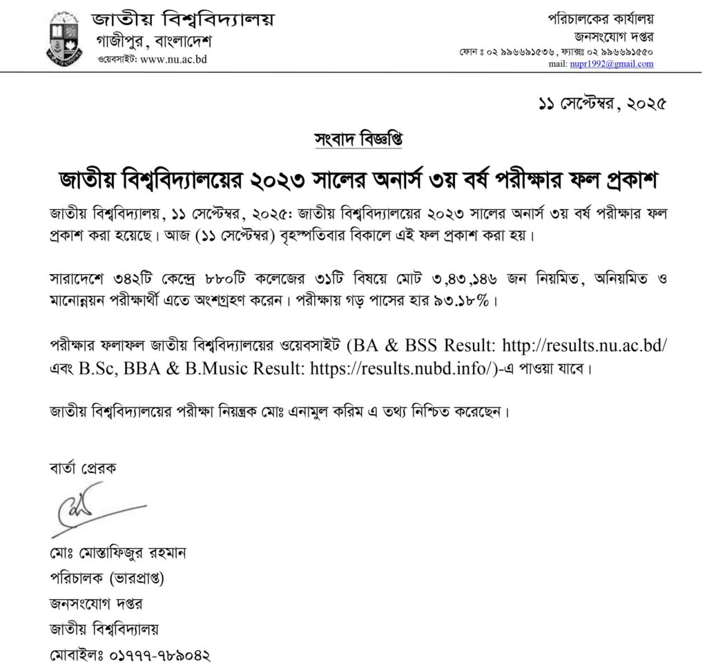 National University 3rd year result 2025 has been published by the authority. The National University has published the results of the Honours 3rd Year Examination 2023 today, Thursday, September 11, 2025. A total of 3,43,146 regular, irregular, and grade improvement students from 880 colleges under 342 centers across the country took part in the examination, which was held in 31 subjects. According to the published results, the average pass rate stands at 93.18%. Students can check their results from the official website of the National University.. This guide explains how to check your NU 3rd Year Result 2025, download your marksheet, and apply for re-scrutiny.